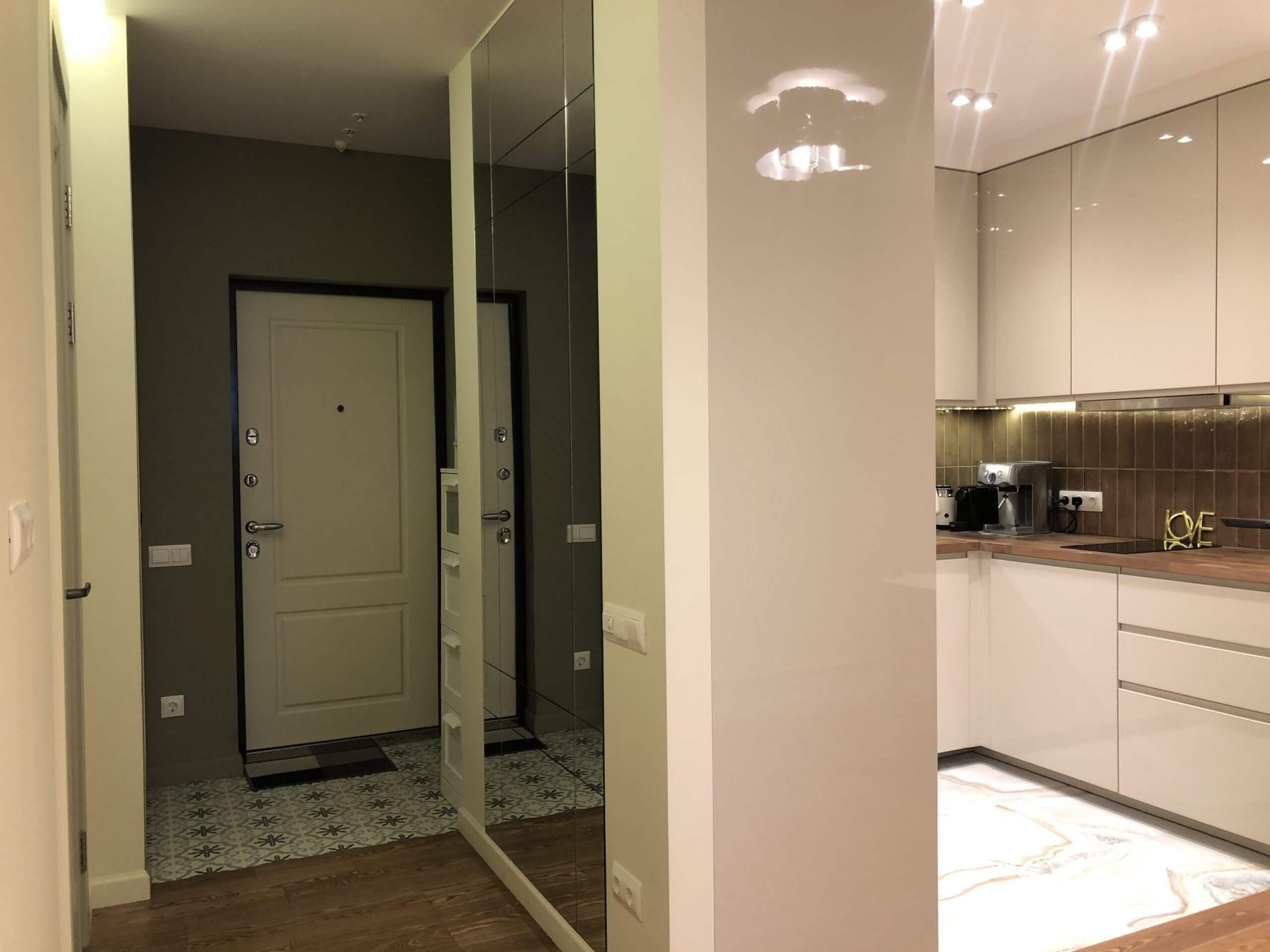 - Перегородка, разделяющая кухонную зону и гостиную, облицована широкоформатной плиткой